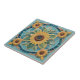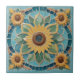 "yellow sunflower flowers", "sunflowers", "aqua blue turquoise teal, "bright happy vibrant", "hot summer heat garden", "decorative flower head", "ornamental floral ceramic tile", "traditional modern contemporary", "faux mosaic tiles", "faux relief"