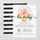 Beautiful floral chic vintage style tea party themed gender neutral baby shower invitation design featuring a pale yellow polka dot vintage faux gold foil teacup with a beautiful watercolor pink floral flower. Faux gold accents are incorporated into the teacup to create a chic classic vintage look. Beautiful blush pink flower is nested in the teacup for a feminine touch. The reverse side of the baby shower invitation features black watercolour stripes and a faux gold foil teapot that contrast beautifully with the front side of the invitation. All illustrations contained in this tea party baby shower invitation are hand-drawn original artwork by Moodthology. You can customise the text size, text colour, font and layout for your own personal design preference.