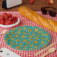 This design is a beautiful pattern of yellow flowers on a teal background.