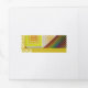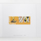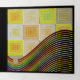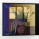 Three things yellow: looking through a window at a vase of tulips, three women in colourful dresses, and a muted rainbow over a background of yellow boxes.