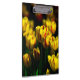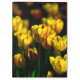 Tulip flowers of yellow and red colour on a flowerbed. Play of sunlight and dark green background. Tulips look like burning candles. Yellow tulip stands for hope, cheerfulness and bright and enigmatic smile.