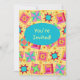 Invite a quilter or quilt lover with this colourful fully customisable quilt invitation. Fully customise on the front and back to add your own words, names and other information. This original quilt art makes a vibrant invitation. Quilt art based on original art features favourite patchwork quilt blocks plus unique blocks in vibrant and dynamic colours of orange, yellow, pink, turquoise, and lime green on a sunny yellow background for a beautiful colour palette. A turquoise teal blue oval is on the front of the card to say "You're Invited" or other words of your choice. Show your love of quilting with these quilt art designs with other quilt art products. Quilt art is original art from fabric and quilt designer Phyllis Dobbs and is in a fabric collection from Quilting Treasures. This art is available on other products and in several colour backgrounds. More products are available in Phyllis' BusinesswithFlair store. Match with coordinating stamps, envelopes, stickers and return address labels.