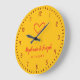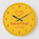 Personalized wedding or anniversary gift idea: a minimal and charming personalized yellow wall clock. The design includes couple's names and wedding date. The clock is decorated with a simple heart illustration as a symbol for love.
