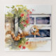 Puzzle with a watercolor painting of a pretty yellow and white striped cat and red flowers in a window flower box