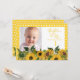 Cute yellow and white polka dots and sunflowers baby girl's first birthday party photo invitation with text, "Brighter than the sun, our little angel is turning one." Personalise with your photo on the front and party information on the back.