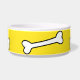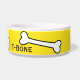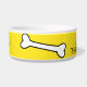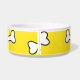 White ceramic dog food / water bowl, with yellow, around the outside. Graphics of cartoon bones, run around the outside of the bowl. Black custom text, on the front, is ready to personalise, for your pet or as a great gift idea for any pet owner. Matching pet products are available.