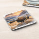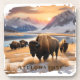 This plastic coaster set is shown with an art print of a bison herd the famous Yellowstone National Park.