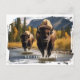 This postcard is shown with a photo print of a bison in the river of Yellowstone National Park.