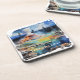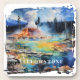 This plastic coaster set is shown with a photo art print of a beautiful geyser in the famous Yellowstone National Park.