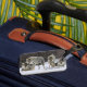 This luggage tag is shown with a photo print of wild wolves in Yellowstone National Park.
