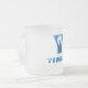 Yemaya frosted glass mug with name and iconic Y and cowries design, both printed in two colours blue.