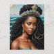 This African deity and royal-core postcard features a classic oil painting style portrait of Yemaya (also known as Yemaja and Yemoja), Yoruba orisha of the ocean and other bodies of water. She is depicted here as a striking black woman wearing an ornate crown atop long natural hair twists, partially styled down and in an updo. Turquoise and gold jewelry complement her rich dark brown skin, and a few strings of pearls are fused in her long hair.