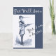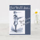 Get well soon card with a silly vintage illustration of a stork in mens clothing and top hat with syringe."Yes, I Am A Doctor" half way down and "Get well soon" at top. White and blue colours.