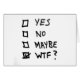 The words,"Yes," "No," "Maybe," and "WTF?" with check boxes next o them. The words are written in black magic marker on a white background. Makes a great gift!