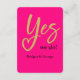 This elegant hot pink and gold wedding design features the phrase “Yes we do!” with the word “Yes” written in a romantic gold script — the sweeping Y cleverly incorporates a heart shape, symbolising love and unity. The minimal chic layout combines bold modern typography with timeless gold accents, creating a luxurious look perfect for formal events, black tie celebrations, or vibrant evening weddings. The names are displayed in graceful calligraphy, adding a touch of personal charm to this sophisticated design.