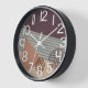 This wall clock has a mid-century modern abstract design of a blue line, a tan triangle, and a brown circle made of dots on a field of dark eggplant and cream. If you want the same design with different colours, message me.