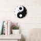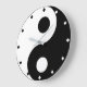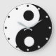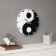 Yin and Yang clock features black and white yin & yang symbol with small diamond-shapes to indicate the numbers placement on the outer perimeter of the clock, with black diamond shapes on the white half and white diamond shaped on the black half. Simple yet striking design.