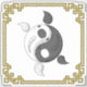 The dark Yin and light Yang the koi swim around one another creating a classic Chinese Taijitu, representing harmony and balance in all things. A classic Chinese border in gold frames the two fish.