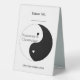 Wedding table number yin yang black and white heart design. Customise this black and white wedding table number with your wedding details. Should you require any help with customising then contact us through the link on this page. Yin yang black and white hearts personalised wedding table number