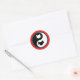 An atypical yin yang symbol inside a red circle, with a cat and dog engaged in the endless chase.