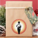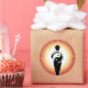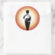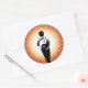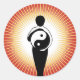 Yin Yang Figure with red and gold sunburst. Abstract eastern figure shown holding a yin yang symbol in arms which are held in a circular position. The Yin Yang symbol has taken the place of the invisible rolling ball in one movement of the Tai Chi exercise Wave Hands Like Clouds.