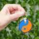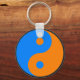 Yin Yang Keychain. This keychain is decorated with a azure and orange Yin Yang symbol. "In Taoist philosophy, yin and yang arise together from an initial quiescence or emptiness and continue moving in tandem until quiescence is reached again. For instance, dropping a stone in a calm pool of water will simultaneously raise waves and lower troughs between them, and this alternation of high and low points in the water will radiate outward until the movement dissipates and the pool is calm once more. Yin–yang, thus, are always opposite and equal qualities. Further, whenever one quality reaches its peak it will naturally begin to transform into the opposite quality: grain that reaches its full height in summer (fully yang) will produce seeds and die back in winter (fully yin) in an endless cycle" - Wikipedia. A great gift idea.