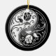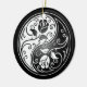 This beautiful yin yang design features two stylised tribal roses. Intricate black and white swirls decorate both sides of this traditional symbol creating a delicate pattern. The two flowers flow from the bottom of the teardrop on either side with leaves growing from the stems. This unique yin yang makes a stunning and stylish ornament design.