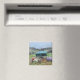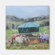 Colourful sheep standing around in the field eating hay on this useful square magnet.
