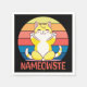 Colourful illustration with "Nameowste" text design and cute Kawaii cat is doing yoga on colourful striped retro background