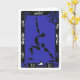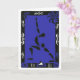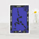 Created from an original linocut print, this image is Virabhadrasana I or the Warrior Pose in black against a vibrant blue/purple background with a decorative border. Virabhadrasana I is one of the fundamental poses of hatha yoga.