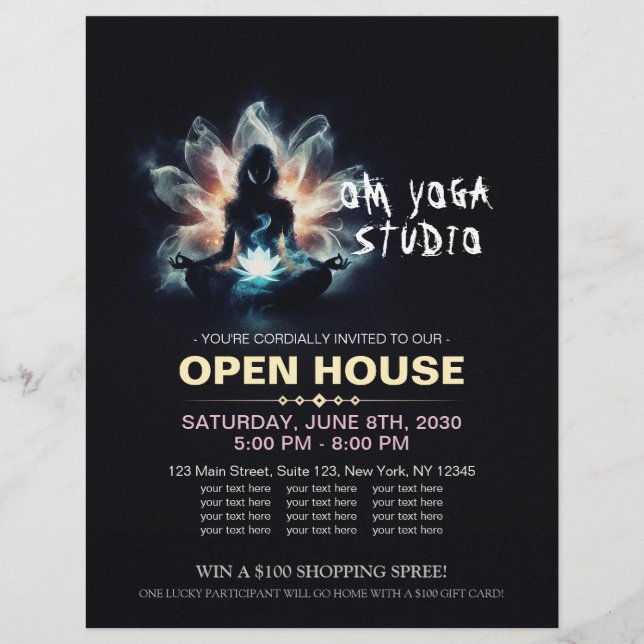 Modern Yoga Fitness Studio / Meditation Instructor / Personal Trainer / Life Coach / Healer / Reiki Master / Massage Therapy Open House Flyer Template - A woman is seated in Sukhasana, also known as the Easy Pose, which is a common posture for yoga and meditation. She is surrounded by an ethereal, swirling mist that emits a soft glow. The mist forms an abstract, flower-like shape around her. The mist and the flower symbolise her spiritual energy and connection to nature. The lotus flower is a sacred symbol in many religions and cultures, representing purity, enlightenment, rebirth, and beauty. The lotus flower is also connected to yoga and meditation, as it is often used as a seat for deities or a focal point for concentration. The white lotus flower in the image signifies her inner peace and harmony.