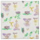 A fun yoga themed fabric with women in a lotus pose and hands in prayer position with purple lotus flowers and delicate sprigs of leaves and golden bows illustrated with watercolor.