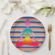 Colorful party paper plates with blue, green, orange stripes and yoga figure. Add your custom text.