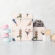 Wrap gifts with this yoga themed wrapping paper designed by Destei. The design features a light beige background with repeating illustrations of yoga women in different poses. One flows into dancer pose, another holds downward facing dog and the third balances in tree pose. Each wears a different outfit with color combinations of pink and black, blue and white, and green and brown. The beige background keeps the design clean and balanced while the illustrated poses bring movement and energy to the pattern.