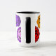 White glass coffee mug with all main yoga reiki seven chakra symbols printed on in full detail in the visible light spectrum order using the representing colours red through violet from left to right with coloured name labels for symbol identification!