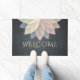 YOGA Studio Meditation Instructor Welcome Doormat Templates - Elegant Colourful Lotus Floral Mandala Symbol on Grunge Dark Background.