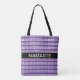 Yoga stylish white striped pattern on violet Tote Bag. Ideal for yoga lovers. Namaste is the yoga greeting that means "My soul greets your soul" or "The divine in me bows to the divine in you".