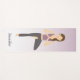 This yoga mat features Destei's illustration of a beautiful brunette girl practicing yoga. The woman is doing the tree pose and her hands are in namaste. She is wearing a lilac shirt and dark grey pants. There is also a personalizable text area for a name in grey colour font. The background is a lilac to white gradient.