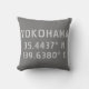 Modern, urban throw pillow design features latitude and longitude coordinates of Yokohama, Japan. Great gift idea for those who love to travel or as a hometown memento.