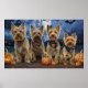 Unleash the spooky spirit with this eerie Halloween design featuring a pack of dogs under a dark, moonlit sky, surrounded by flying bats and glowing pumpkins. Perfect for those who love a touch of frightful fun with their furry friends!