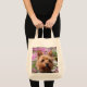 The printing came out very well, better than I had anticipated. The natural color fabric is sturdy with strong seams and comfortable handles. This tote fits easily over my shoulder. As it is filled, the bottom flattens out--very cool! I would buy this product again. This grocery tote holds a lot of groceries! The image quality was very good. The colors were a little darker than I had expected. The darkness may have been due to printing on a natural color fabric rather than on white. The cat design is attractively centered on the tote. The spirit of the design is very lively, just as it appears on the Zazzle website.