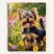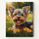 This delightful notebook showcases an endearing image of a young Yorkshire Terrier puppy amidst a picturesque field of blooming wildflowers.