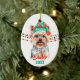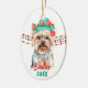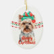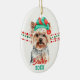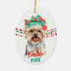 A cute Yorkshire Terrier dog wears a red and green Santa Claus hat in front of strings of red and green Christmas beads on both sides of this ornament. At the bottom are two text fields in matching red and green for your own text. The back has the same image with a third text field in red. Perfect for anyone who is owned by a Yorkie!