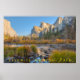 A serene landscape photograph captures the beauty of Yosemite Valley. The image features a calm Merced River flowing through a meadow, with towering Cathedral Rocks rising in the background. The river is dotted with smooth, grey rocks, and the foreground is filled with lush, green grass and reeds. The cliffs are bathed in warm sunlight, casting long shadows across the valley.
