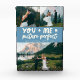Whimsical and playful wedding keepsake featuring 3 photos of the newlyweds with a typography text that says "you + me = picture perfect." Denim blue.