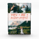 Whimsical and playful wedding keepsake featuring 3 photos of the newlyweds with a typography text that says "you + me = picture perfect." Peach.
