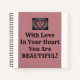 You Are Beautiful! is a stunning inspiration that reminds us that beauty is found in all of love! This stylish notebook has a pink with white background and a blossomed heart on top!