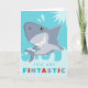 Funny thank you card for kids. Illustration of a shark jumping out of the ocean with a smile on his face. There is a dangerous looking bite mark on the top right. The text at the bottom says "you are fintastic" in red, blue, and gray colorful font. Express your gratitude with style with this card.