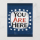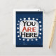 "You Are Here" is a cute text design in blue with black and red text, along with a white accent shape and white textured whimsical dots surrounding it.
