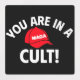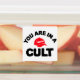 - “You Are In A Cult” in sharp black typography